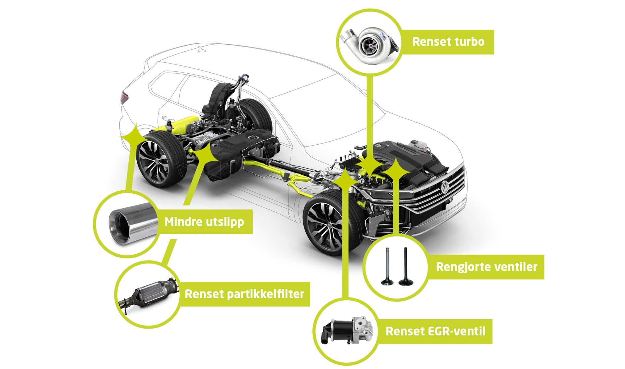 Det er forbrenningsprosessen i motoren som forårsaker sot-/karbonavleiringer i sylindere, stempler, partikkelfiltre, EGR-ventiler og turboer. Tilsotede deler forhindrer at motoren fungerer som den skal.